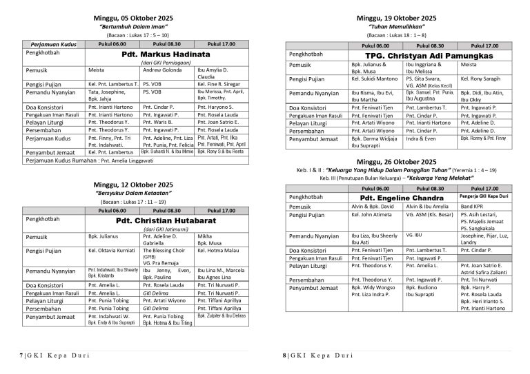Setiap hari Minggu, Pk. 06.00 WIB (Kebaktian I) Pk. 08.30 WIB (Kebaktian II) Pk. 17.00 WIB (Kebaktian III)
